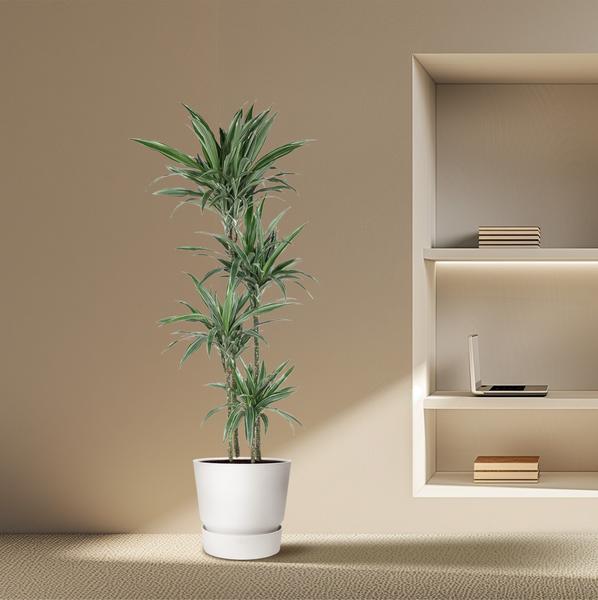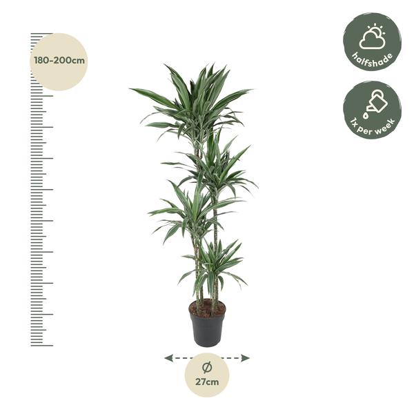 - De Dracaena Warneckei is een stijlvolle kamerplant met lange, smalle bladeren die een levendig groen kleur hebben, versierd met een opvallende, witte rand. De bladeren groeien rechtop en creëren een elegante, volle uitstraling die perfect is voor elk interieur.