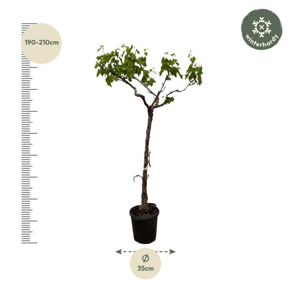 - De Druivenboom (Vitis Vinifera) heeft een indrukwekkende, vertakte stam met rijke groene bladeren die een volle, weelderige uitstraling creëren. In de zomer kunnen er trossen druiven aan de plant verschijnen, wat niet alleen prachtig is, maar ook heerlijk fruit oplevert.
