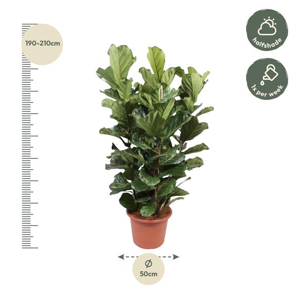 - De Ficus Lyrata vertakt heeft grote, glanzende bladeren die een opvallende vioolvorm hebben. De bladeren zijn diepgroen met duidelijke nerven die de plant een robuuste uitstraling geven.