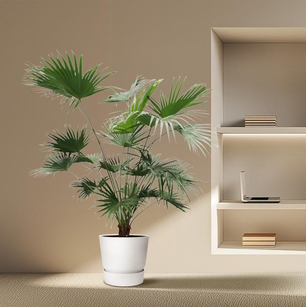 - De Livistona Chinensis, ook wel bekend als de Chinese Waaierpalm, heeft prachtig waaiervormige bladeren met dunne, elegant hangende segmenten. De bladeren zijn diep donkergroen en hebben een licht glanzend oppervlak, wat zorgt voor een levendige en tropische uitstraling.