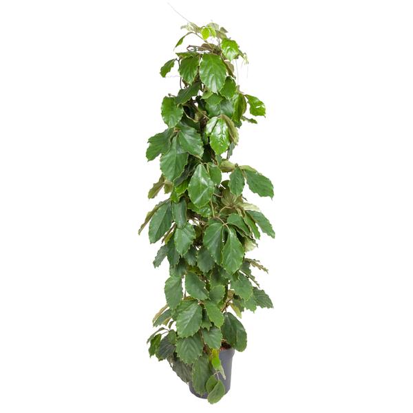 - Uiterlijk van de plant: De Tetrastigma Voinierianum heeft grote, gelobde bladeren die groen zijn met een lichte glans. De plant groeit in een klimmende of sluipende vorm, wat hem een tropische uitstraling geeft. Bij de juiste verzorging kunnen er kleine, onopvallende bloemen verschijnen.